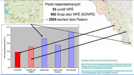 Srovnal jsem si různé oblasti z hlediska nezaměstnanosti. Ty uvnitř NPŠ, ze svazu dvaadvaceti obcí a pak třeba Vyšebrodsko. Je to oblast, která není v NP, ale navazuje na ni a svým charakterem je jí hodně podobná. A taky průměr okresu Český Krumlov a na závěr Bruntálsko. To jsem vybral jako příklad vyšší územní jednotky, kde je ta nezaměstnanost velkým problémem. Výsledek je jasný. Ti, kteří nejvíc křičí, tedy některé obce uvnitř Národního parku Šumava, mají vůbec nejnižší nezaměstnanost v rámci celého regionu.