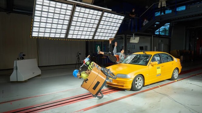 Jak vypadal crash test? ADAC ve své speciální hale nasimulovat situaci, při které do cyklisty zezadu narazí vozidlo v rychlosti 30 km/h pod úhlem 45 stupňů. Jde o simulaci situace, kdy motorista při odbočování cyklistu přehlédne. V hale ale místo skutečných dětí a cyklisty byly jen figuríny.