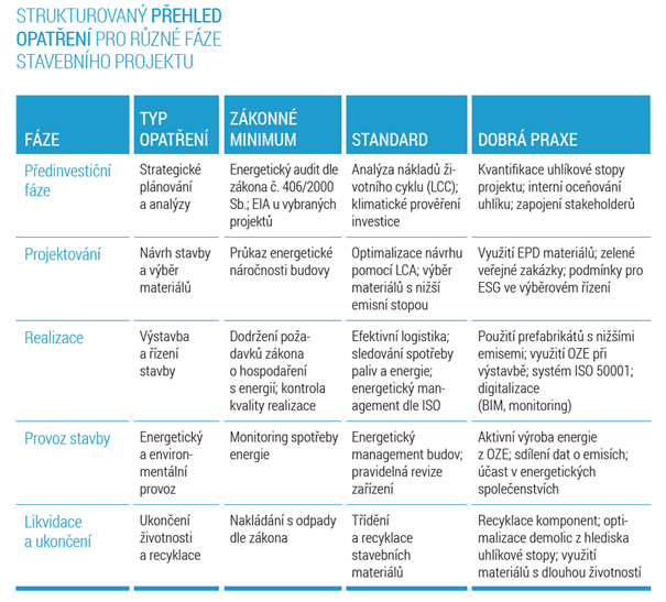 Tabulka poskytuje strukturovaný přehled opatření pro různé fáze stavebního projektu:
