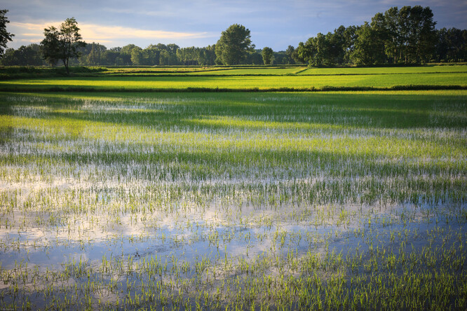 "Za normálních okolností by toto pole mělo být zaplaveno dvěma až pěti centimetry vody, ale teď to tu vypadá jako na písečné pláži," říká pěstitel rýže Giovanni Daghetta, když prochází usychajícími rýžovými poli u města Mortara. Tamní zemědělci již po staletí pěstují proslulou rýži Arborio, která díky svým širokým zrnům dobře vstřebává chutě, a je tudíž vhodná pro přípravu rizota.