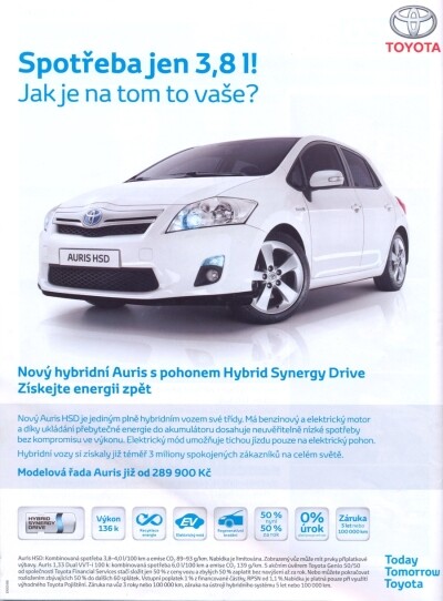 Podstatou reklamy (viz ilustrace) byla propagace hybridního vozu Auris, jeho nízké spotřeby a unikátních vlastností. Následovala informace o ceně: „Modelová řada Auris již od 289 900 Kč“.