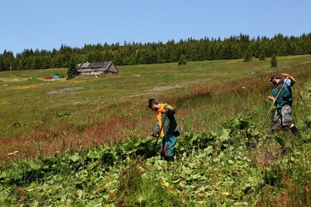 Účastníci tábora kosí orchidejové louky u říčky Olešenky