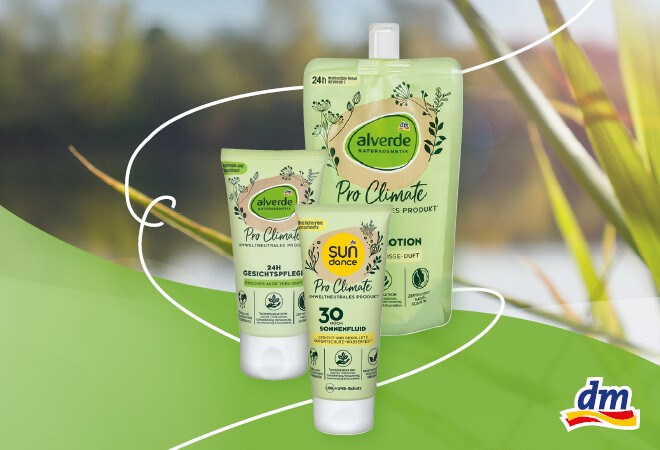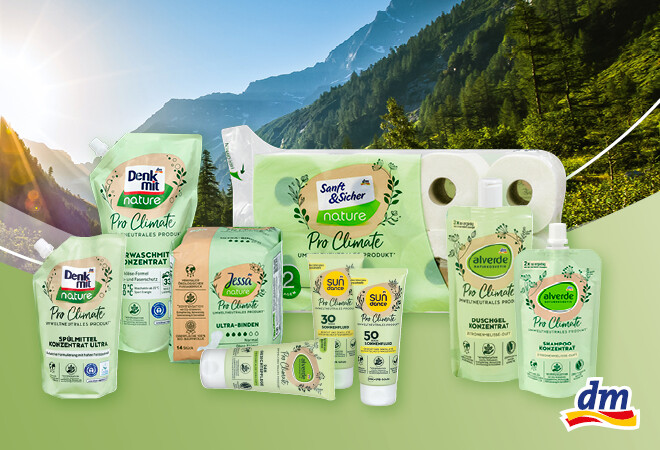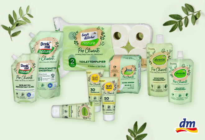 Tématu trvalé udržitelnosti se společnost dm věnuje dlouhodobě, již v minulosti se uchýlila ke snížení spotřeby plastů a naopak zvýšení podílu recyklovaného materiálu v obalech, zavedení širší nabídky tuhých produktů v papírových krabičkách nebo zařazení plnicích stanic na ekodrogerii do prodejen. Novinkou v sortimentu jsou produkty řady Pro Climate, kterou nabízí privátní značky jako alverde, Denkmit, Jessa, SUNDANCE či Sanft&Sicher.