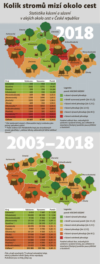 Nejlépe na tom byl v roce 2018 Liberecký kraj, kde za každý vykácený strom silničáři vysadili necelé 2 nové. Na opačném konci žebříčku se umístil Karlovarský kraj s jediným vysazeným stromem za 9 poražených. Z české krajiny i nadále mizí levná a účinná ochrana před extrémními teplotami a suchem i naše historické dědictví.