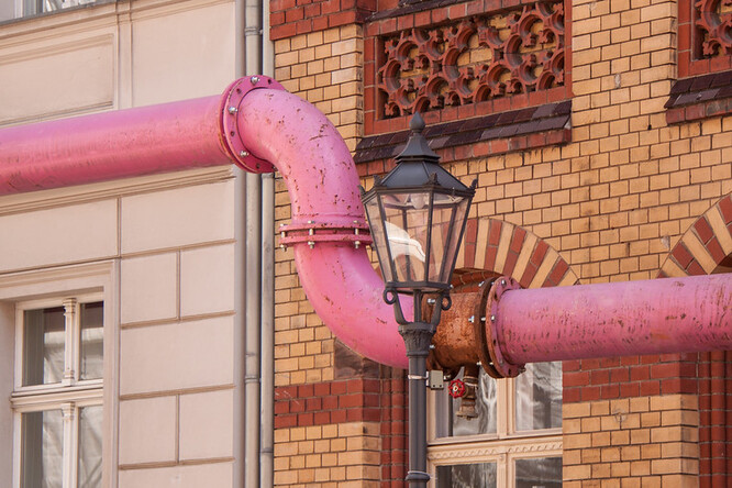 Berlínem se vine růžové a modré potrubí, umělecký projekt to není