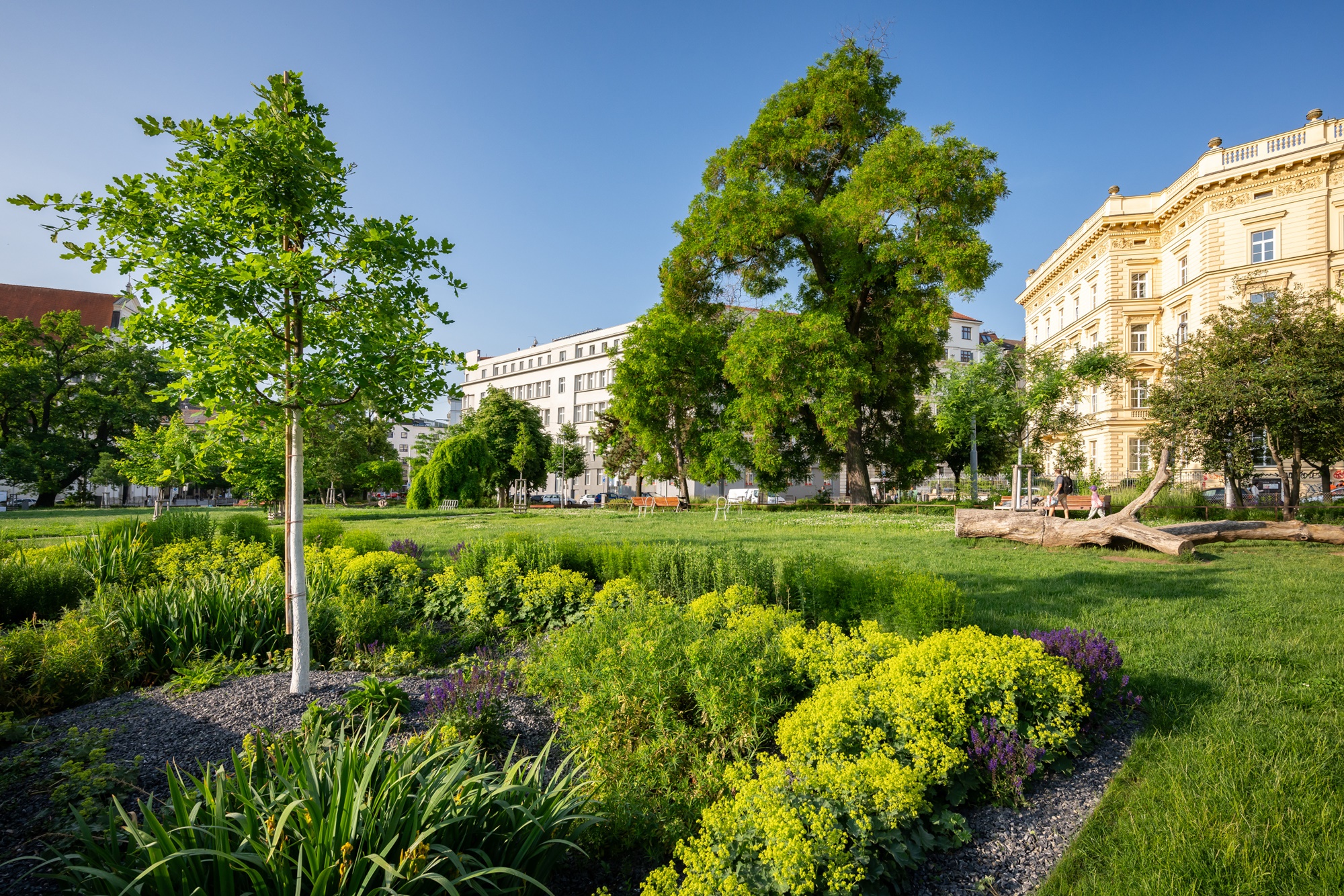 Moravské náměstí: vibrující místo s poetikou klidu i akce. V kontrastu s okolním šumem a tepem města a dopravy se představuje jeho nová podoba – veřejný prostor v historickém centru moravské metropole. Ukázkově využívá modrozelenou infrastrukturu, rozmanitou skladbu biotopů, spoluvytváří komunitu a inspiruje k dalším proměnám. Zdroj | Nadace Partnerství