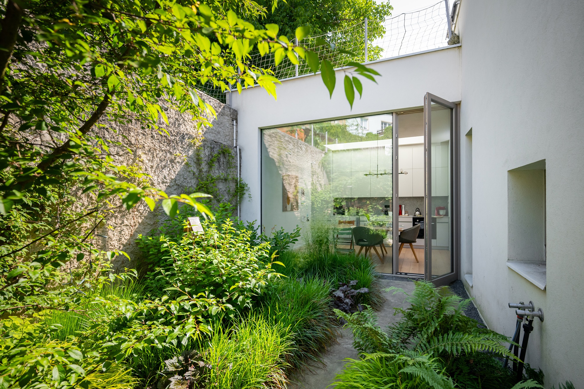 Z původně generacemi poslepovaného a sto let starého domu se stala moderní a minimalistická budova, která ale přesto zachovává vesnický ráz s ohledem na své nejbližší okolí. Projekt se vypořádal i s menším a svažitým pozemkem, který tvoří dvě patra zahrady, a do celé plochy včetně plochých střech integroval prvky zeleně a přírody. Dům naplňuje prvky estetiky i udržitelnosti, i přes své tlusté zdi je zateplený, vytápěný strategicky umístěnými okny a vybavený rekuperací. S ohledem na přírodu využívá sběr dešťové vody a je důkazem, že starou budovu není vždy nutné hned bourat a zatracovat. Zdroj | Nadace Partnerství