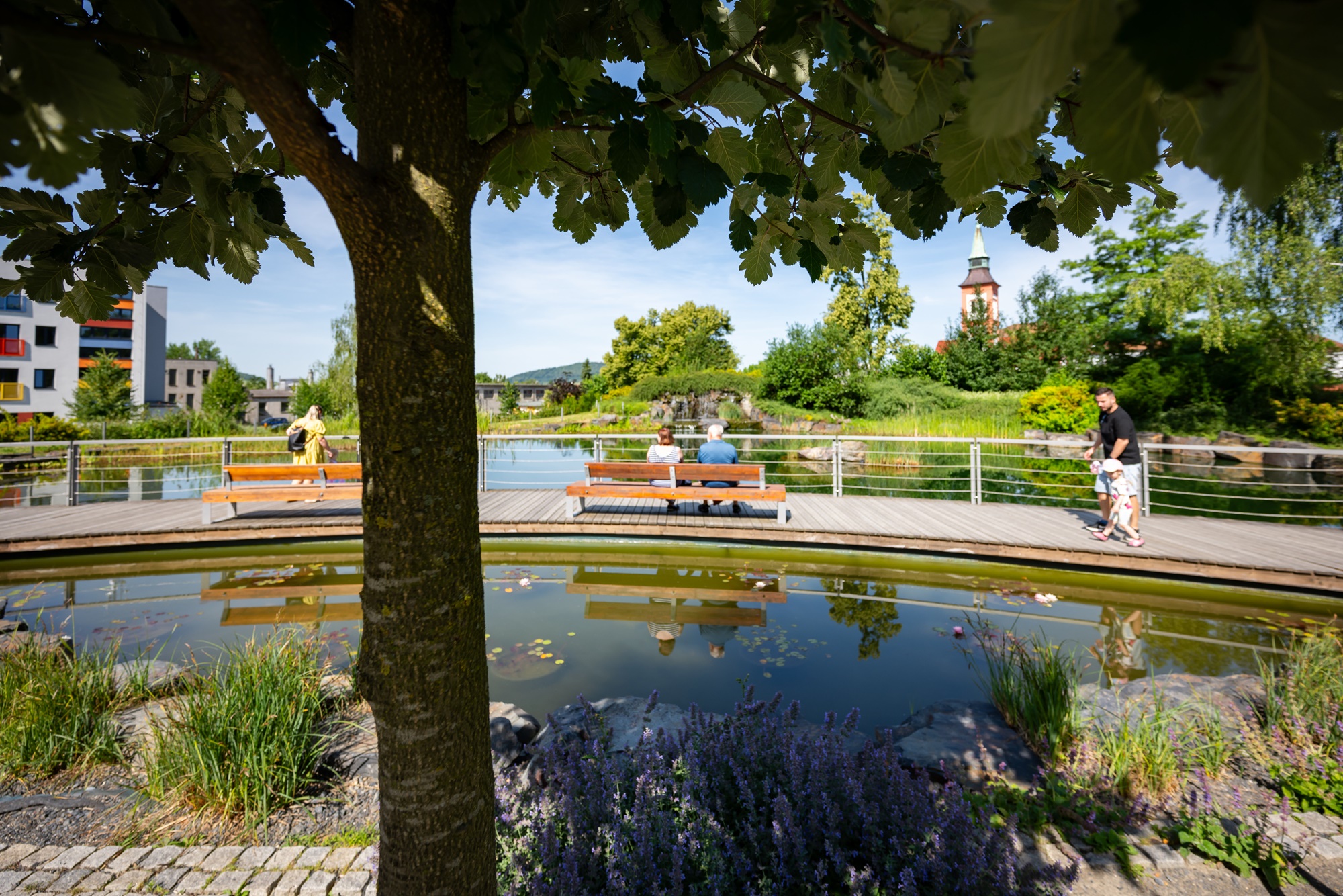 Zarostlé letní kino se proměnilo v živé, zelené srdce města. V Novém Jičíně vznikla příjemná relaxační zóna s jezírkem, květinovými záhony a místem pro setkávání lidí všech generací. Návštěvníci tu najdou lavičky ve stínu stromů, upravené chodníky, mobilní kavárnu, prostor pro menší kulturní akce i tiché posezení u vody. Nově vysazená zeleň a vodní plocha pomáhají zmírňovat přehřívání města, zlepšují mikroklima a zadržují vodu v území. Město zapojilo do návrhu i obyvatele, takže výsledný prostor skutečně odpovídá jejich představám – a rychle si získal oblibu místních i návštěvníků. Zdroj | Nadace Partnerství