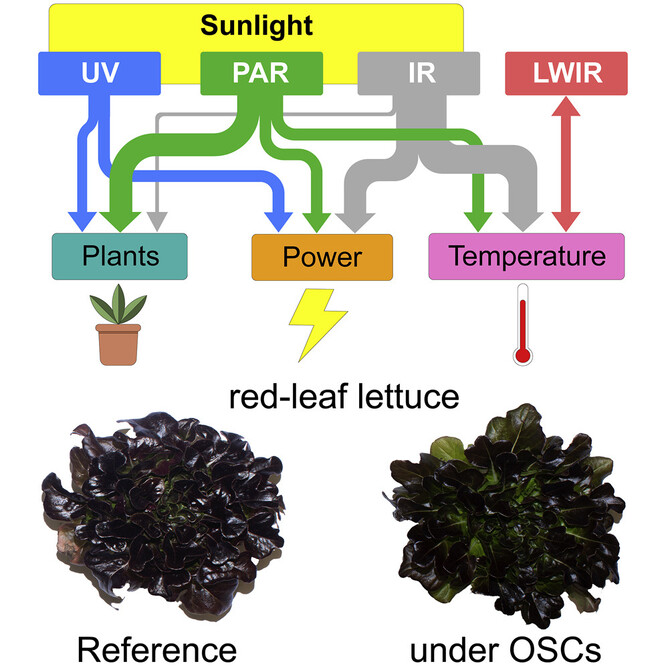 Vědci testovali novou technologii na skleníku, v němž pěstovali červený hlávkový salát. Díky filtrům použitým na solárních panelech měli tři různé testovací skupiny salátu. Jak v těchto skupinách, tak v kontrolní skupině, v níž nebyly použity žádné filtry, měly totožné podmínky (teplotu, koncentraci CO2, množství vody a hnojiva). Podařilo se jim zjistit, že mezi vypěstovanými saláty nebyly v zásadě žádné rozdíly. Naopak se ukázalo, že solární panely pomáhaly regulovat teplotu skleníku.