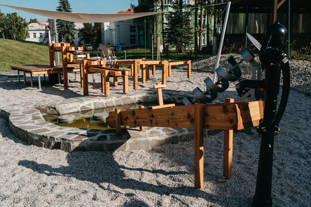 Jedno z dětských hřišť má i prvky na čerpání vody.