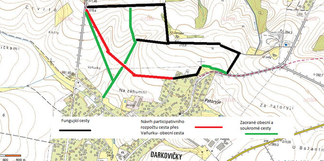 31.7.2020 21:51 Reaguje na Jan DrbušekJe více možností, jak to řešit, ale vzhledem k tomu, že vede na hranici katastru, stálo by za to domluvit se se sousední obcí Darkovice (na její straně je taktéž parcela široká 2-3 metry ve vlastnictví obce).