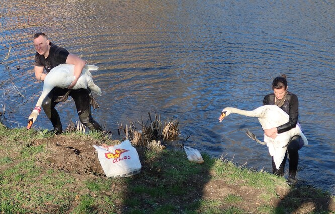 Pár labutí pak ochránci přírody převezli do klidnější lokality, kterou po dlouhých úvahách vybrali a kde by měly mít ptáci klid od lidí, kteří je v centru města stále rušili, nevhodně krmili a znesnadňovali klidné hnízdění. "Pokud se jim bude na lokalitě dařit, možná bychom se od tohoto páru mohli dočkat i nějakých dochovaných mláďat. Většinou v předchozích letech o ně pár přicházel právě kvůli nepříznivým podmínkám a lidským zásahům v centru města. Zatím se ale nenašla lokalita, která by překonala mocnou touhu po jejich původním hnízdišti, a tak se vždy každý rok pár vrátil zpět na řeku do centra," dodala Černá.
