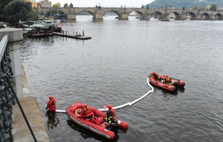 "Skvrna se šířila v okolí ukotvených lodí, přesný zdroj znečištění se ale nepodařilo zjistit," uvedl. Skvrna dlouhá 100 až 150 metrů se už dál nešířila. Hasiči umístili na hladinu takzvané absorbční hady, které umožňují zachytit uniklé chemikálie či palivo, a použili sorbet.