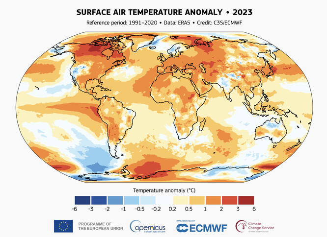„Rok 2023 byl výjimečný a klimatické rekordy padaly jako domino. Rok 2023 je nejen nejteplejším rokem v historii měření, ale také prvním rokem, kdy byly všechny dny teplejší o více než °C než v předindustriálním období,“ vysvětluje Samantha Burgessová, zástupkyně ředitele služby Copernicus pro změnu klimatu. „Teploty během roku 2023 pravděpodobně překonaly teploty jakéhokoli období za posledních nejméně 100 000 let.“