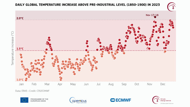 První známky toho, jak neobvyklý bude rok 2023, se začaly objevovat na začátku června, kdy teplotní anomálie ve srovnání s předindustriálním obdobím 1850-1900 dosáhly několik dní po sobě 1,5 °C. Ačkoli to nebylo poprvé, co denní anomálie dosáhly této úrovně, nikdy předtím se to v tomto ročním období nestalo. Po zbytek roku 2023 se globální denní teplotní anomálie nad 1,5 °C stávaly pravidelným jevem, a to až do té míry, že téměř 50 % dnů v roce 2023 bylo o více než 1,5 °C nad úrovní z let 1850-1900.