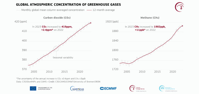 Koncentrace skleníkových plynů v roce 2023 dosáhly podle C3S a Copernicus Atmosphere Monitoring Service (CAMS) nejvyšších hodnot, jaké kdy byly v atmosféře zaznamenány. Koncentrace oxidu uhličitého v roce 2023 byly o 2,4 ppm vyšší než v roce 2022 a koncentrace metanu se zvýšily o 11 pb. Pro rok 2023 činí roční odhad koncentrace oxidu uhličitého v atmosféře 419 ppm a pro metan 1902 ppb. Tempo nárůstu oxidu uhličitého bylo podobné tempu pozorovanému v posledních letech. Míra nárůstu metanu zůstala vysoká, ale byla nižší než v posledních třech letech