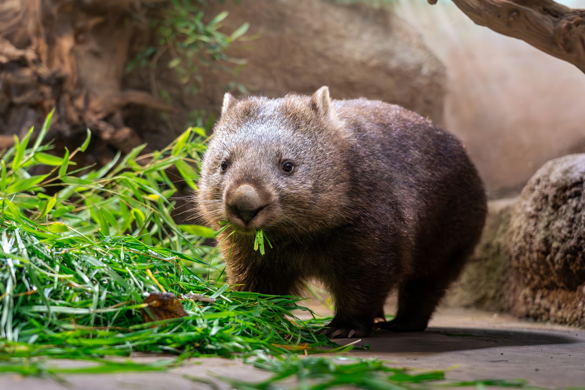 Vombat obecný je nejbližším příbuzným koaly, obývá Tasmánii a vlhčí oblasti Austrálie. Své teritorium si značí trusem, který má neobvyklý tvar krychle. Velkou část života tráví hloubením podzemního systému nor a chodeb. Z tohoto důvodu mají samice vak obrácený otvorem dozadu, aby mládě nezasypávaly hlínou.