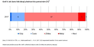 Lidí, kteří ve výzkumu uvedli, že bio potraviny alespoň občas kupují, jsme se dále ptali, jak často dávají potravinám s označením “bio“ přednost před těmi, které toto označení nemají. Největší část respondentů, necelé dvě pětiny (37%), uvedla, že potravinám s označením bio dává přednost před těmi bez této známky pouze zřídka. Necelá desetina respondentů (9 %) jim dává přednost často, 5 % respondentů nikdy a pouhé 1 % dotázaných uvedlo, že bio potravinám dává přednost vždy. Stejné množství (tedy 1 %) respondentů zvolilo odpověď “nevím“. Z hlediska dalších charakteristik respondentů jsme nezaznamenali rozdíly na základě věku, životní úrovně či vzdělání.