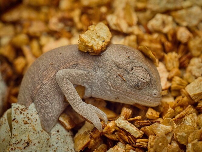 Mláďata se nyní postupně líhnou v zázemí terarijní expozice. Inkubace vajec tohoto druhu trvá několik měsíců. Při líhnutí může mládě protrhávat skořápku i desítky hodin. Čerstvě vylíhlí jedinci měří několik centimetrů a jsou extrémně citliví na podmínky prostředí. "Ihned po líhnutí chameleony přesouváme do odchovných terárií, kde mají připravené ideální podmínky. Netrvá to dlouho a začnou sami přijímat potravu, kterou jsou zpravidla malé mušky octomilky nebo čerstvě vylíhnutí cvrčci. Velmi dbáme na to, aby byla potrava plná živin a mláďata díky tomu prosperovala," popsal péči o mláďata kurátor Zooparku Zájezd Jiří Marek mladší.