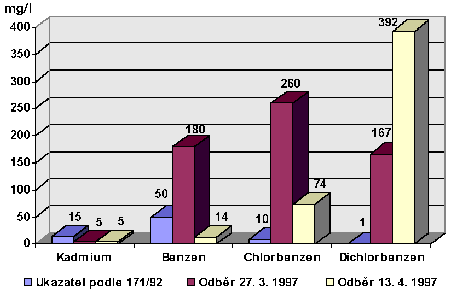Na grafu nahoře vidíte výsledky rozboru odpadních vod vytékajících z retenční nádrže v Synthesii Pardubice přímo do Labe. Z množství látek jsme vybrali tři organické látky (benzen, chlorbenzen a dichlorbenzen) a jeden těžký kov (kadmium). Interpretace tohoto grafu není zrovna jednoduchá.